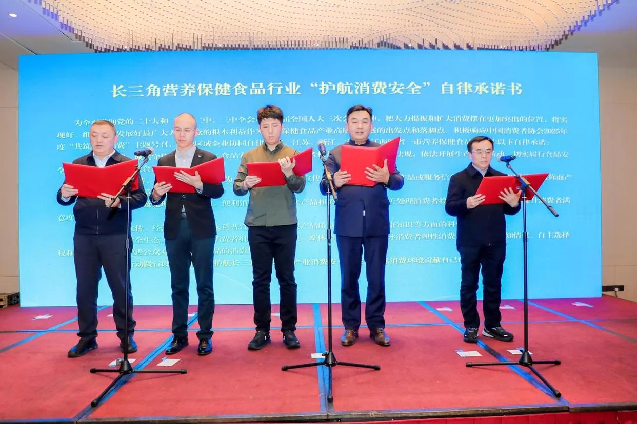 5家企业代表共同宣读《长三角营养保健产业护航消费安全》自律承诺书
